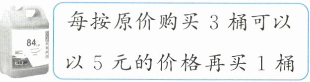 3+1=4(桶) 32÷4=8(组) 8×5=40(元) 760-40=720(元) 32-8=24(桶) 720÷24=30(元) 答:每桶消毒液的原价是 30 元。 解析 因为每按原价购买 3 桶后加 5 元可以再买 1 桶,所以购买的32 桶中有多少组 4 桶就有多少桶的价格为5 元。用 32÷4 求出以优惠价购买了 8 次,乘 5 即可求得 8 桶的总价。用 760 元减去这 8 桶所花费的钱就是按原价买消毒液的总价,32 桶减去 8 桶等于 24 桶,用剩下的总价除以数量即可求解。
