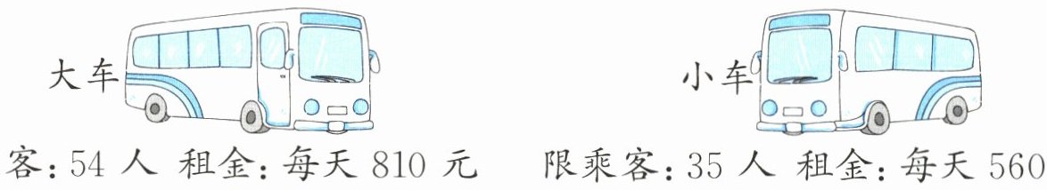 (2)810÷54=15(元) 560÷35=16(元) 15<16 197÷54=3(辆)……35(人) 35÷35=1(辆) 810×3+560=2990(元) 答:租 3 辆大车和 1 辆小车租金最少,最少需要 2990 元。