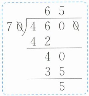 6. 为了迎接六一儿童节,某工厂生产了4600个玩具,准备每70个装一箱。观察右边的竖式,这些玩具能装满(□)箱,至少再生产(□)个又能装满一箱。