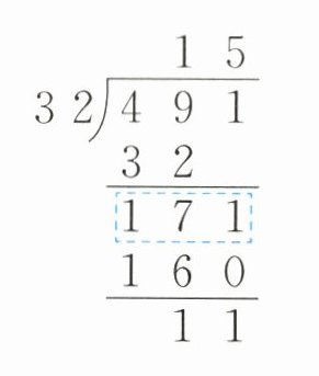 5. 为了鼓励学生主动运动,红旗小学购买了491根跳绳,每班分32根。下面竖式中虚线框里的数表示的实际意义是(□)。