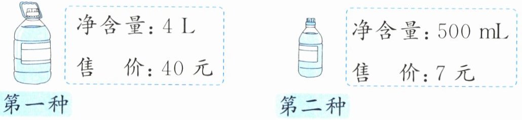 4升=4000毫升 4000毫升里面有8个500毫升。7×8=56(元) 40<56 答:买第一种规格的油比较划算。