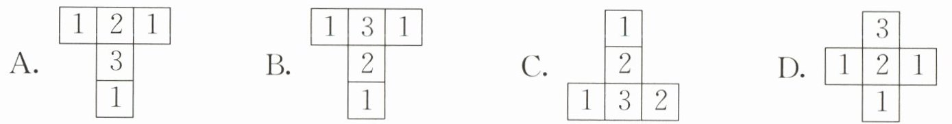 5. 若□表示该位置上有1个正方体,■表示该位置上有2个正方体,以此类推,则从上面观察右面的物体,画出的平面图是( )。
