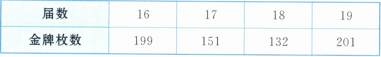2. 第19届亚运会在杭州成功举行,我国体育代表团获得了优异成绩。从第9届亚运会开始,我国就蝉联亚运会金牌榜榜首。下面是我国体育代表团第16~19届亚运会获得金牌数量统计表。