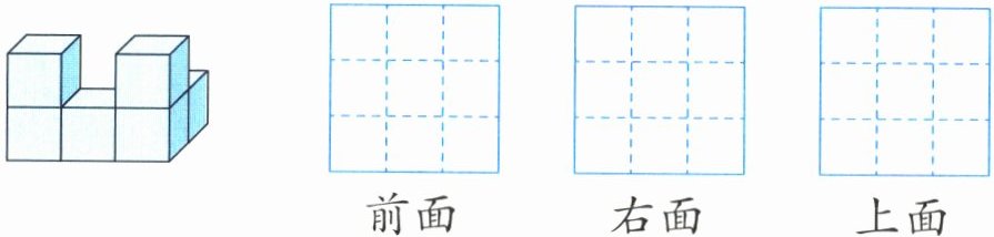 1. 观察下面的物体,分别画出从前面、右面和上面看到的图形。(6分)