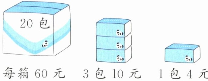 60÷20=3(元) 10÷3=3(元)……1(元) 3<10÷3<4 所以整箱买最便宜,单包买最贵,应多买整箱装的面巾纸。 450÷60=7(箱)……30(元) 7×20=140(包) 30÷10×3=9(包) 140+9=149(包) 答:最多能买149包。