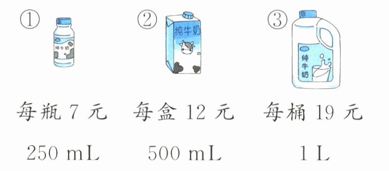 1 升=1000 毫升 1000 毫升里面有 4 个 250 毫升,有 2 个 500 毫升。7×4=28(元) 12×2=24(元) 28>24>19 答:买③号规格的纯牛奶最合算。