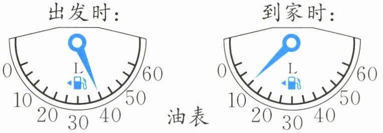 4. 西湖是中国主要的观赏性淡水湖泊之一。小珊一家周末驱车前往西湖游玩,行程前后的油表情况如图。已知这辆汽车每行驶3千米耗油250毫升,照这样计算,此次行程行驶了多少千米?(7分)