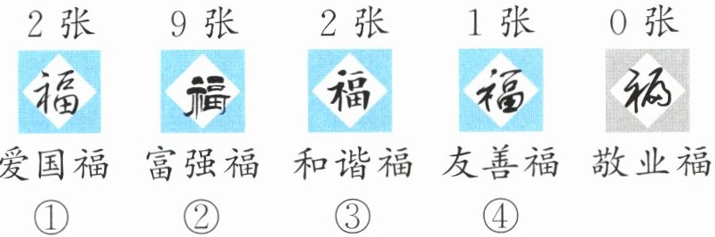 1. 下面是天天的五福卡包。在卡包中随机复制一张(敬业福不能复制),他最有可能复制到( ),复制到( )的可能性最小,复制到( )和( )的可能性相等。(填序号)