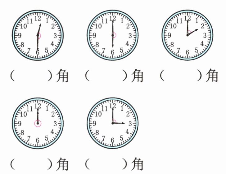 3. 写出钟面上时针和分针所形成的角的名称,再把各类型的角按从大到小的顺序排列。