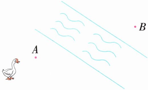 解析:因为小鹅擅长游泳,走路却很吃力,所以设计的路线要尽量短。小鹅从点A到河边最短路线就是该点到河边垂直线段,从河边到点B最短路线就是该点到河边垂直线段,小鹅在河里游泳路线就是以下河处和上岸处为端点线段