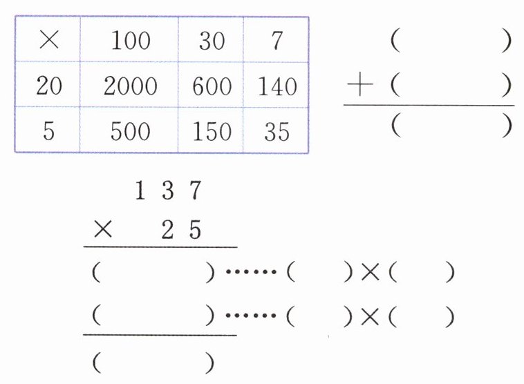 2561 2875 9951 解析:根据1□7×13,□里最小填0,最大填,积应该是1000多到2000 多,并且个位上是1,所以得数是2561;根据23×□□5,两个乘数个位上分别是3和5,积的个位上一定是5,所以得数是2875;因为□□7×93 的得数至少是9000多,所以得数是9951。