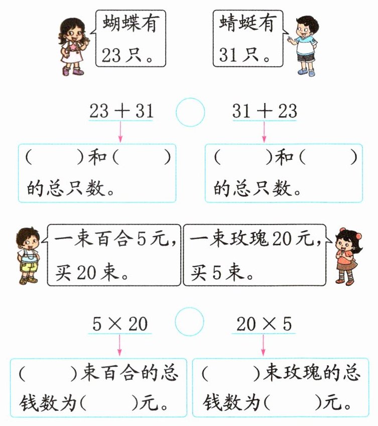 4. 用竖式计算下面各题,并用加法交换律或乘法交换律进行验算。