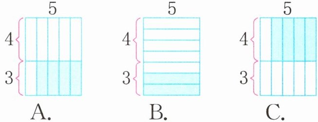 (2)小虎在用乘法分配律计算$(4+3)×5$时,错写成了$4×5+3$,结果比原来小。下面涂色表示减少的部分,正确的是( )。