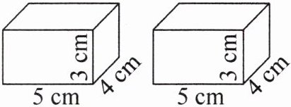 2. 两个长方体的表面积之和:(5×4×2+5×3×2+4×3×2)×2=188(平方厘米) 大长方体的表面积有3种可能:①188-5×4×2=148(平方厘米) ②188-5×3×2=158(平方厘米)③188-4×3×2=164(平方厘米)