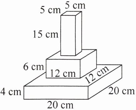 2. 表面积:20×20×2+20×4×4+12×6×4+5×15×4=1708(平方厘米) 体积:20×20×4+12×12×6+5×5×15=2839(立方厘米)