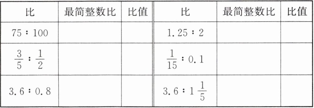1.(竖着看)$3:4$ $\frac{3}{4}$ $6:5$ $1.2$ $9:2$ $4.5$ $5:8$ $0.625$ $2:3$ $\frac{2}{3}$ $3:1$ $3$