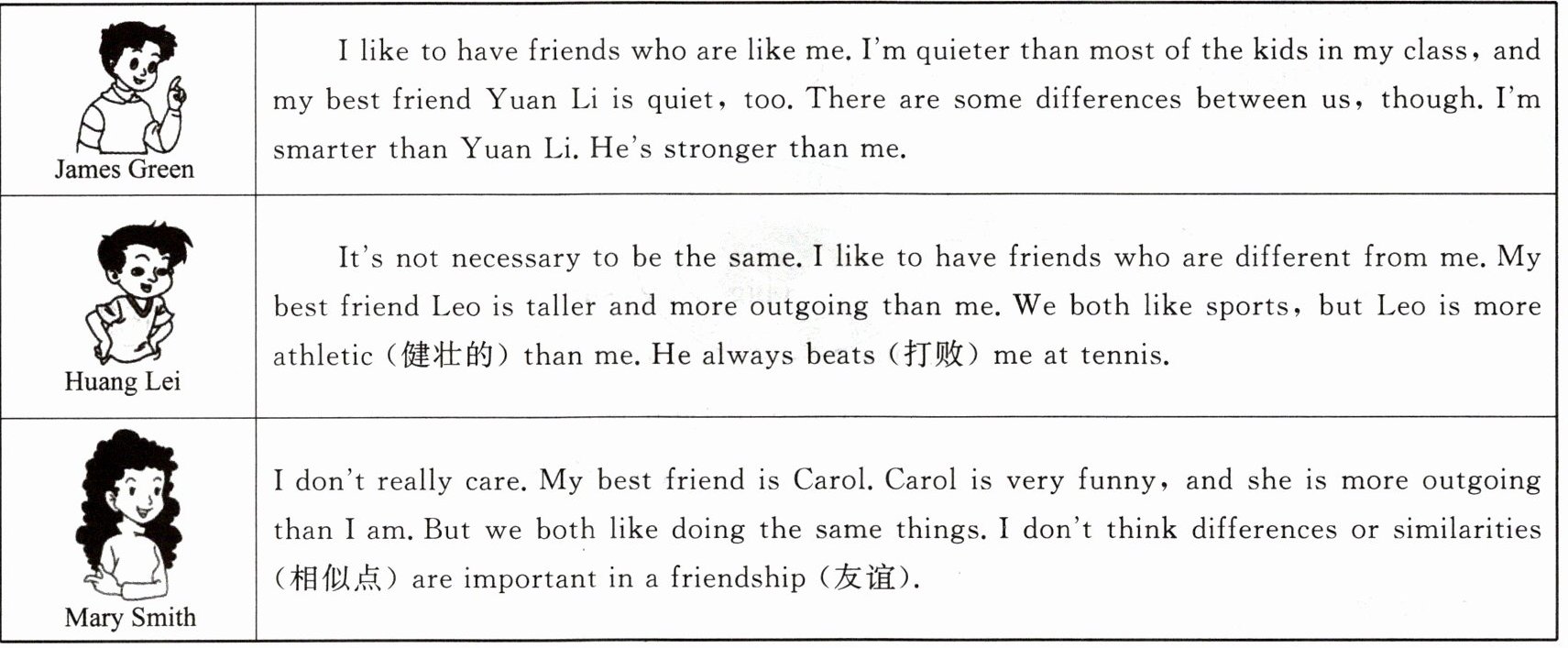 1.B 细节理解题。根据"I'm quieter than most of the kids in my class,and my best friend Yuan Li is quiet,too."可知,两人都很安静。2.D 细节理解题。根据"My best friend is Carol."可知,她最好的朋友是Carol。3.D 细节理解题。根据"I like to have friends who are different from me."可知,黄磊喜欢和与自己不一样的人做朋友。4.C 细节理解题。本文针对"朋友应该是不同的还是相同的"给出了三个人的看法。5.A 细节理解题。根据"There are some differences between us,though."可知,詹姆斯·格林和他最好的朋友之间有一些不同。