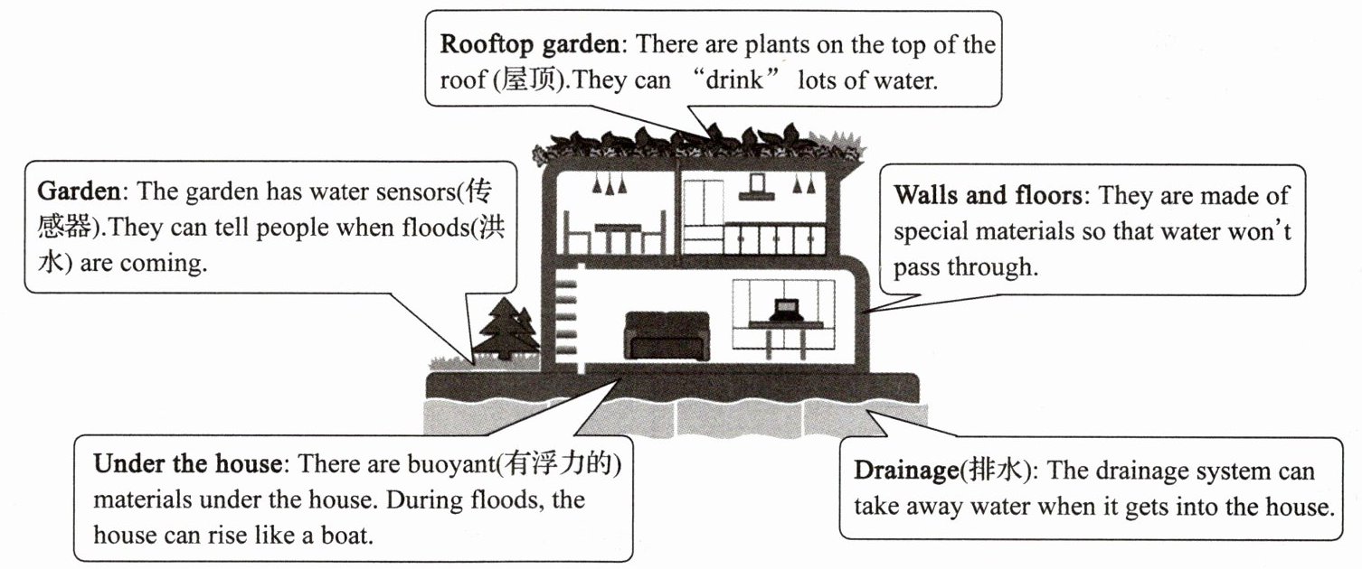 1.B 细节理解题。根据“There are plants on the top of the roof. They can ‘drink’ lots of water.”可知,它们能吸收大量的水。2.C 细节理解题。根据“There are buoyant materials under the house. During floods,the house can rise like a boat.”可知,房子下面有浮力很强的材料。洪水期间,房子会像船一样上浮。3.D 推理判断题。根据房屋的构造可知,各项设施都有预防洪水的作用,由此可知,建造这个特殊的房子是为了在洪水期间保持安全。