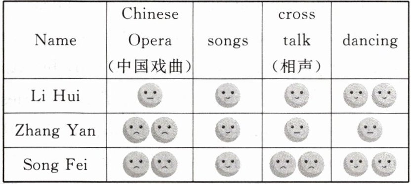 Step 3:A reporter from a TV station asked students from a middle school about the Spring Festival Gala. Here are their likes and dislikes.