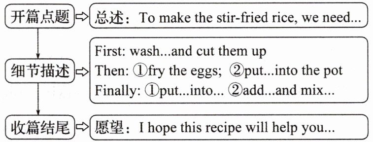 你校的英国交换生莉娜(Lina)上周来你家吃晚饭。她觉得你妈妈做的什锦炒饭很好吃,并希望能学习一下它的制作方法。请你根据下列表格中的内容写一篇短文,介绍什锦炒饭的制作步骤。