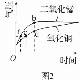 D A、利用二氧化锰作催化剂,反应需要时间短,说明该反应中二氧化锰的催化效果比氧化铜好,正确。B、化学反应速率与催化剂的种类有关,正确。C、可通过对比图2中的b、d点来比较两种催化剂的效果,正确。D、过氧化氢质量相等,最终生成氧气质量相等,错误。
