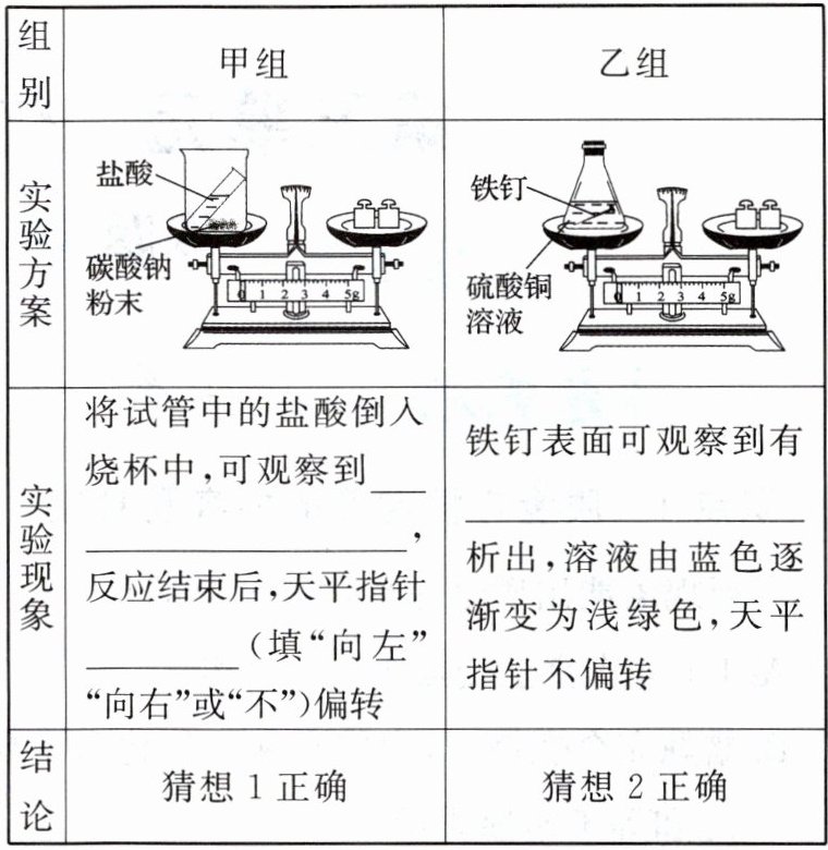 (1)甲组:将试管中的盐酸倒入烧杯中,碳酸钠和盐酸反应生成氯化钠、二氧化碳和水,观察到有气泡产生,固体粉末逐渐消失;由于生成了二氧化碳,二氧化碳是气体,会散逸到空气中,导致质量减小,结束后,天平指针向右偏转;乙组:铁和硫酸铜反应生成硫酸亚铁和铜,现象为铁钉表面可观察到有红色固体析出,溶液由蓝色逐渐变为浅绿色,天平指针不偏转;