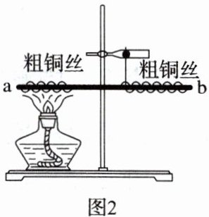 如图2所示实验,在一根用细铜丝吊着的玻璃棒两端分别绕上10 cm长的粗铜丝,并使玻璃棒保持水平,然后用酒精灯加热a端的粗铜丝2 min。(已知:铜在空气中加热,会和空气中的氧气反应生成氧化铜固体)
