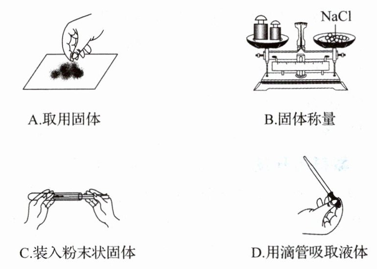 (2)①A中瓶塞没有倒放,标签没有朝向手心 ②B中鼻孔凑到容器口闻试剂的气味 ③D中试管没有横放,直接加块状试剂