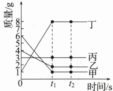 8 在密闭容器中加入甲、乙、丙、丁四种物质,在一定条件下发生化学反应,测得反应前及 $t_1$、$t_2$ 时各物质质量变化情况如图所示,下列说法正确的是 (
