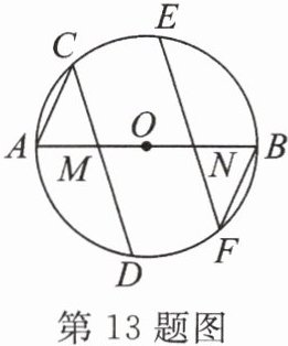 13. 如图,过$\odot O的直径AB上两点M$,$N$,分别作弦$CD$,$EF$,$CD// EF$,$AC= BF$.求证: