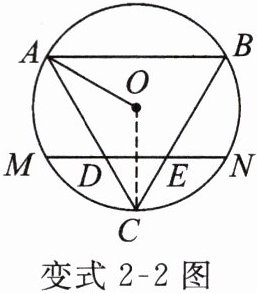 变式2-2 如图,在$\triangle ABC$中,$AC= BC= 5$,$AB= 6$,$D为AC$上一点,作$DE// AB交BC于点E$,点$C关于DE的对称点为点O$,以$OA为半径作\odot O恰好经过点C$,并交直线$DE于点M$,$N$,则$MN$的长为______