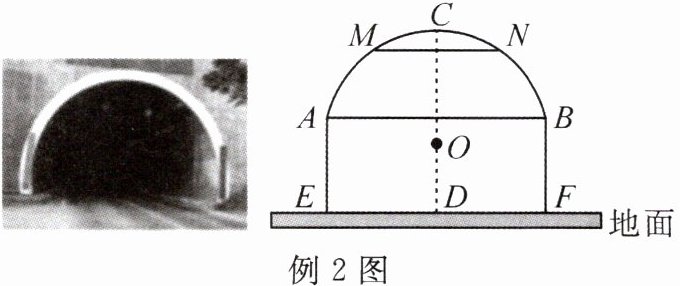 例2 某公路上有一隧道,如图,隧道顶部是圆弧形拱顶,圆心为$O$,隧道的水平宽$AB$为24m,$AB离地面的高度AE= 10m$,拱顶最高处$C离地面的高度CD= 18m$,在拱顶的$M$,$N$处安装照明灯,且$M$,$N$离地面的高度相等且都等于17m,求$MN$的长.