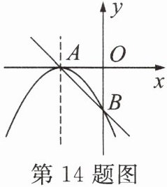 14. (数形结合)如图,直线$y= -x-2$交x轴于点A,交y轴于点B,抛物线$y= a(x-h)^{2}$的顶点为A,且经过点B.