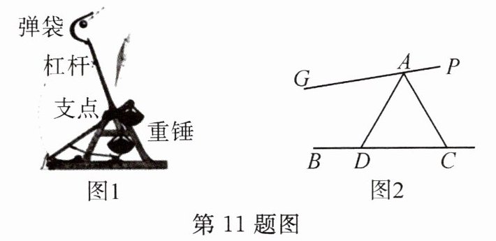11. 如图1所示的是古代一种可以远程攻击的投石车,图2是投石车投石过程中某时刻的示意图,GP是杠杆,弹袋挂在点G,重锤挂在点P,A为支点,D是水平底板BC上的一点,AD= AC= 3米,CD= 3.6米.