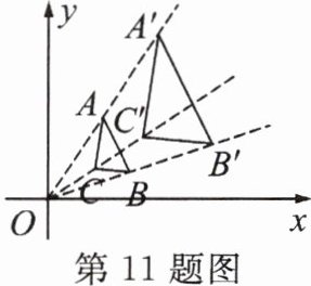 11. 如图,在平面直角坐标系中,$△ABC和△A'B'C'$是以坐标原点 O 为位似中心的位似图形,且$B(3,1),B'(6,2).$