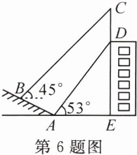 6. 教育部颁布的《基础教育课程改革纲要》要求每位学生每学年都要参加社会实践活动,某学校组织了一次测量探究活动。如图,某大楼的顶部竖有一块广告牌CD,小明与同学们在山坡的坡脚A处测得广告牌底部D的仰角为53°,沿坡面AB向上走到B处测得广告牌顶部C的仰角为45°,已知山坡AB的坡度i= 1:2.4,AB= 13米,AE= 29米。