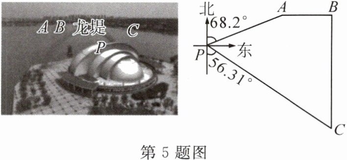 5. 东昌湖西岸的明珠大剧院,隔湖与远处的角楼、城门楼、龙堤、南关桥等景观遥相呼应。如图所示,城门楼B在角楼A的正东方向520m处,南关桥C在城门楼B的正南方向1200m处。在明珠大剧院P测得角楼A在北偏东68.2°方向,南关桥C在南偏东56.31°方向(点A,B,C,P四点在同一平面内),求明珠大剧院到龙堤BC的距离(结果精确到1m,参考数据:sin68.2°≈0.928,cos68.2°≈0.371,tan68.2°≈2.50,sin56.31°≈0.832,cos56.31°≈0.555,tan56.31°≈1.50)。