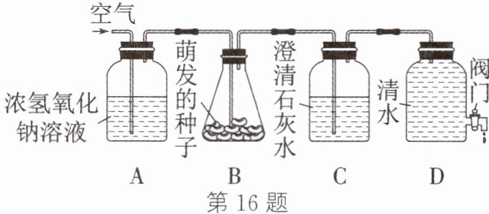 16.(6分)(温州中考)绿色植物的呼吸作用会产生二氧化碳,小明猜想:种子的萌发过程可能也会产生二氧化碳。于是他设计了如图所示的实验装置。打开D装置中的阀门,水位下降,空气就会依次进入装置。
