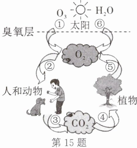 15. 自然界中物质的循环形成了自然界中物质的平衡。如图所示为氧在自然界中的主要循环途径。请根据图示回答下列问题: