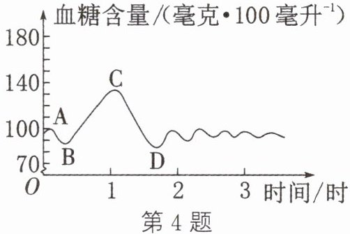 4. (德州中考)如图所示为正常人饭后一段时间内血糖含量变化曲线,有关叙述中,不正确的是 (