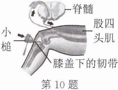 10. 如图所示为与膝跳反射相关的结构示意图,试分析并回答下列问题: