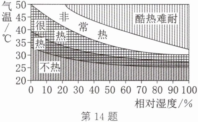 14. (温州中考)人体在不同的外界环境中,对热的感觉有不同的程度,散热越困难时往往会感觉越热,人的热感与气温、相对湿度的关系如图所示。
