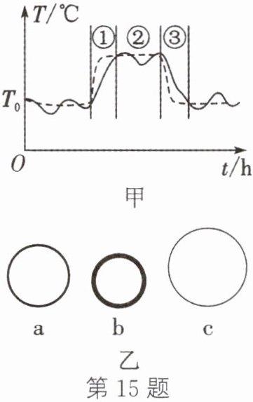 15. 如图甲所示为人体发热的三个阶段体温变化的大致曲线图,$T_{0}$为人体正常体温。