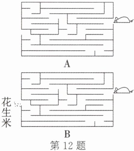 12. 某科学兴趣小组为了探究小鼠走迷宫获取食物的行为,设计了一个迷宫如图所示,图A和图B中的一只小鼠正在通过相同的迷宫。图B的出口处有一些炒香的花生米,图A的出口处则没有,请回答下列问题: