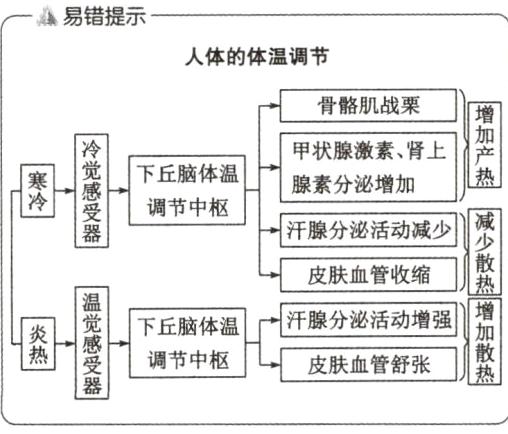 B 解析:一桶冰水从头顶浇下→皮肤冷觉感受器→下丘脑体温调节中枢→增加产热(骨骼肌战栗、立毛肌收缩、甲状腺激素和肾上腺素分泌增加,代谢增强),减少散热(毛细血管收缩、汗腺分泌减少)→体温维持相对恒定,此过程既有神经调节,也有激素调节。故B错误。