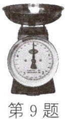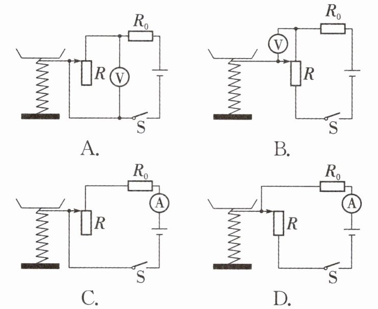 9. (绍兴中考)学习了“质量测量工具的进化”的相关课程,小敏认识并使用了如图所示的台秤,她发现指针偏转角度与所测物体质量成正比。根据台秤示数变化规律,小敏想选用电流表或电压表的示数来反映所测物体质量大小,下列设计的电路中,最合理的是(