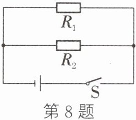 8. (北京中考)在如图所示的电路中,电阻 $ R_1 < R_2 $。开关 $ S $ 闭合后,$ R_1 $、$ R_2 $ 两端的电压分别为 $ U_1 $、$ U_2 $,通过 $ R_1 $、$ R_2 $ 的电流分别为 $ I_1 $、$ I_2 $。下列判断中,正确的是(