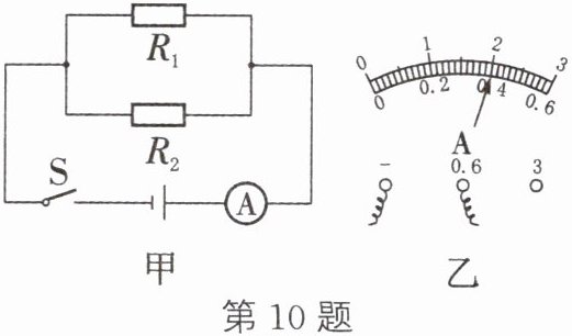 10. (宁波中考)在如图甲所示的电路中,电源电压不变,$ R_1 $、$ R_2 $ 是定值电阻,$ R_1 = 10 Ω $。闭合开关 $ S $,电流表的示数如图乙所示,当 $ R_1 $ 由于某种原因开路时,电流表的示数变为 0.1 A。
