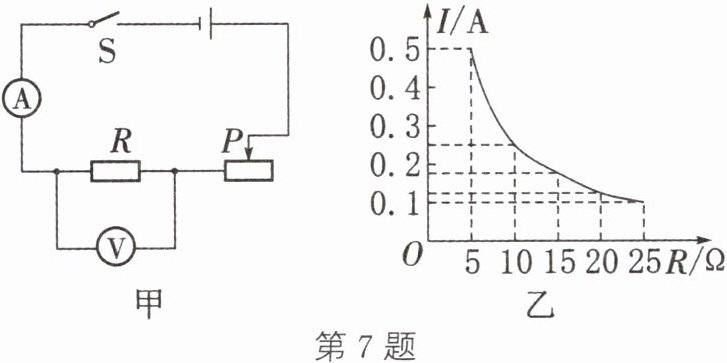 7. 如图甲所示为小鲁同学探究“导体中电流与电阻的关系”的实验电路图,电源电压保持 6 V 不变,分别将 5 Ω、10 Ω、15 Ω、20 Ω、25 Ω 的定值电阻 $ R $ 接入电路,他根据实验数据绘制出的 $ I - R $ 关系图像如图乙所示,实验中电压表的示数保持______V 不变;为完成整个实验,小鲁同学应该选取最大阻值不小于______Ω 的滑动变阻器。