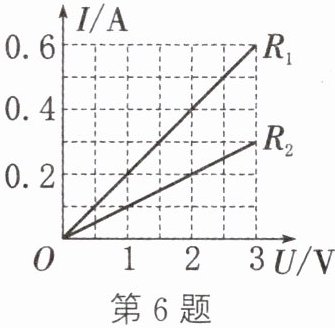 6. (宜昌中考)在“探究电流与电压的关系”的实验中,小军分别画出了电阻 $ R_1 $ 和 $ R_2 $ 的 $ I - U $ 图像如图所示。下列说法中,正确的是(